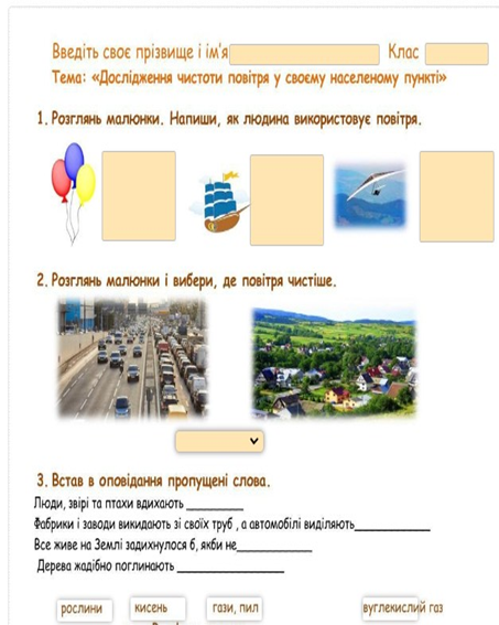 When organizing research "Properties of air" for students with a complex speech disorder, teachers can offer students a task to establish the correspondence (air condition - pollution level) or supplement the missing words based on the use of the online service liveworksheets (Fig.7).
